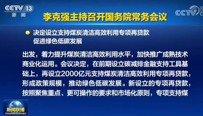 会议指出,我国能源资源禀赋以煤为主,要从国情实际出发,着力提升煤炭清洁高效利用水平,加快推广成熟技术商业化运用。会议决定,在前期设立碳减排金融支持工具的基础上,再设立2000亿元支持煤炭清洁高效利用专项再贷款,形成政策规模,推动绿色低碳发展。此次设立的2000亿元专项再贷款,按照聚焦重点、更可操作的要求和市场化原则,专项支持煤炭安全高效绿色智能开采、煤炭清洁高效加工、煤电清洁高效利用、工业清洁燃烧和清洁供热、民用清洁采暖、煤炭资源综合利用和大力推进煤层气开发利用。具体方式是,全国性银行向支持范围内符合标准的项目自主发放优惠贷款,利率与同期限档次贷款的市场报价利率大致持平,人民银行可按贷款本金等额提供再贷款支持。同时会议要求,统筹研究合理降低项目资本金比例、适当税收优惠、加强政府专项债资金支持、加快折旧等措施,加大对煤炭清洁高效利用项目的支持力度。