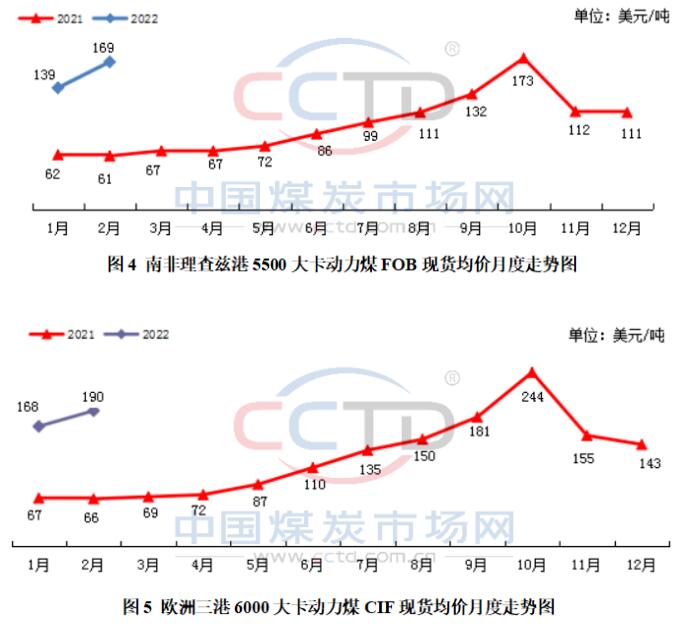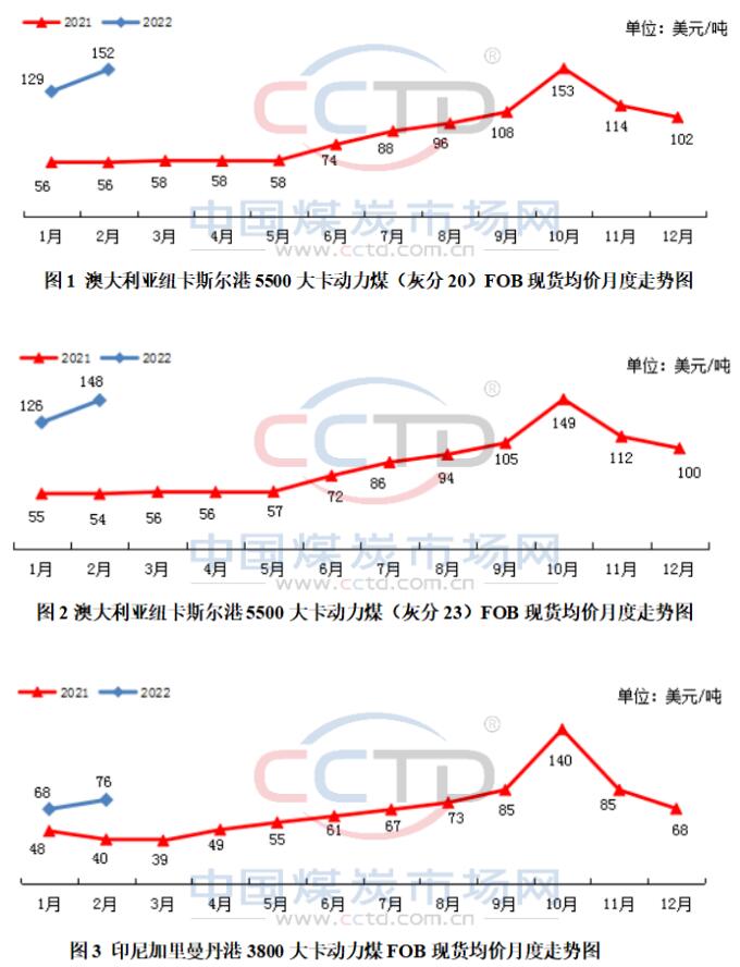2月初,正值中国春节假期,国内工业生产活动有所放缓,进口煤需求减弱,同时印尼煤炭出口禁令进一步放宽,此前受疫情和天气影响的澳大利亚煤炭生产和运输情况也有所改善,国际市场供应紧张局面略有好转,国际动力煤价格从前期的一路上涨开始小幅回落。然而,价格在短暂回落后又开始持续上涨,2月份国际动力煤价格整体呈上行态势。