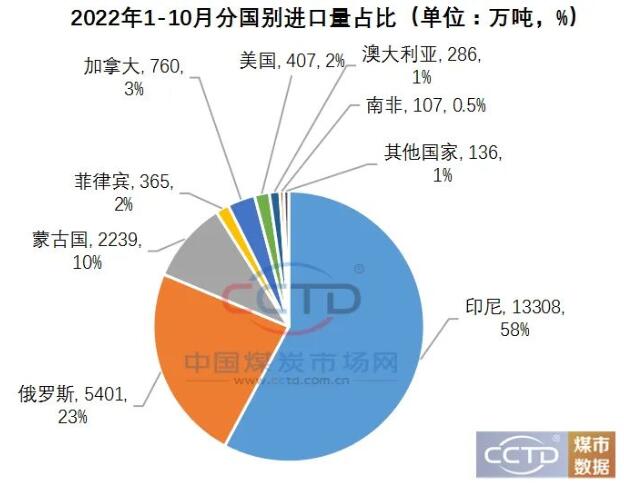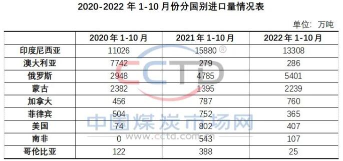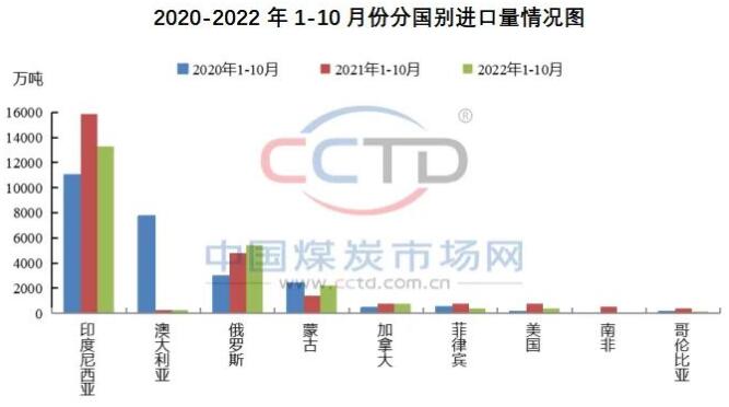 2022年1-10月份,除了从俄罗斯和蒙古国进口煤炭数量同比增加外,我国从印尼、加拿大、菲律宾、美国、南非和哥伦比亚的进口煤数量同比均出现减少,尤其是从南非和哥伦比亚进口煤数量降幅较为明显,同比降幅分别为80%和94%。此处需要说明的是,2021年和2022年澳大利亚煤炭进口量均为此前滞留在港在后期得以通关的量,不具有参考性。