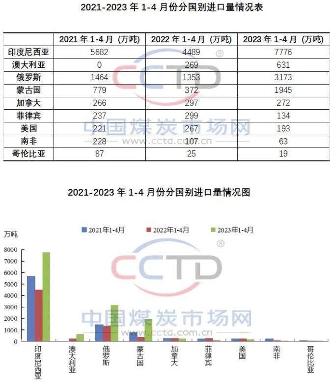 2023年1-4月份,我国从蒙古国、澳大利亚、俄罗斯和印度尼西亚进口煤炭数量同比均出现明显增加,同比涨幅分别为423%、135%、134%和73%。